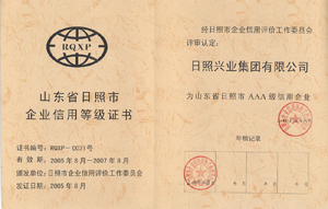 ·2007年3月,日照市企業(yè)信用評價工作委員會評審認(rèn)定興業(yè)集團(tuán)為“山東省日照市AAA級信用企業(yè)”