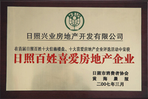 ·2007年3月,興業(yè)房地產(chǎn)被日照市消費(fèi)者協(xié)會日照百姓喜愛房地產(chǎn)企業(yè)