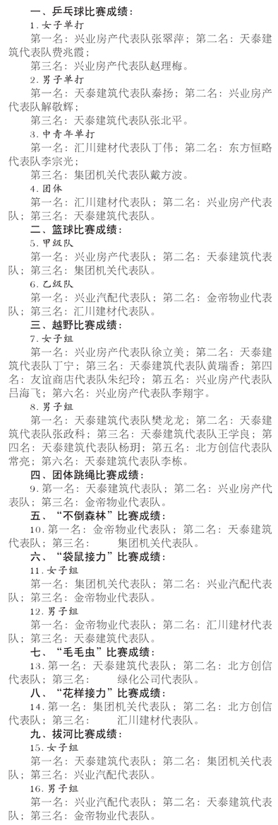 興業(yè)集團(tuán)第十三屆職工運(yùn)動會各項目比賽成績