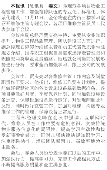 金帝物業(yè)召開維修主管專題培訓(xùn)會議