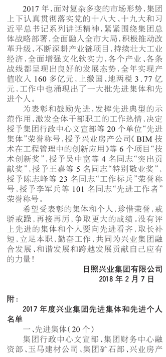 關(guān)于表彰2017年度先進(jìn)集團(tuán)和先進(jìn)個(gè)人的決定